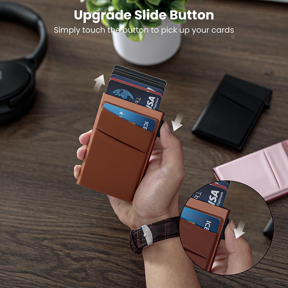 - Quick Card Access: There is a "slider" mechanism on the side of the mens slim wallet. When using the mechanism - you will see your cards pop out orderly, which make you access the cards quickly